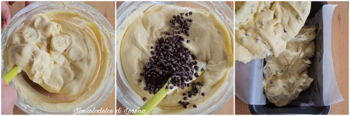 Di seguito incorporate delicatamente con la spatola le banane tagliate a rondelle (o meglio ancora a dadini), e le gocce di cioccolato.