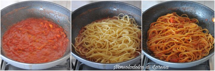 Mescolate e cuocete il sugo di pomodoro a fuoco medio per 10-15 minuti, se c’è bisogno, aggiungendo un goccio di acqua della pasta.