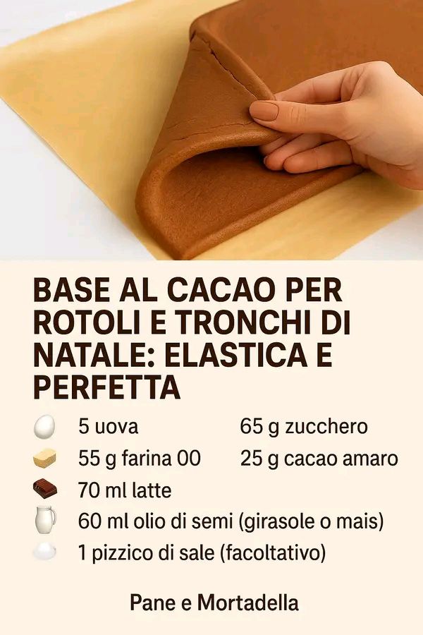 BASE AL CACAO PER ROTOLI E TRONCHI DI NATALE: ELASTICA E PERFETTA INGREDIENTI 5 uova 65 g zucchero 55 g farina 00 25 g cacao amaro 70 ml latte 60 ml olio di semi (girasole o mais) 1 pizzico di sale (facoltativo)