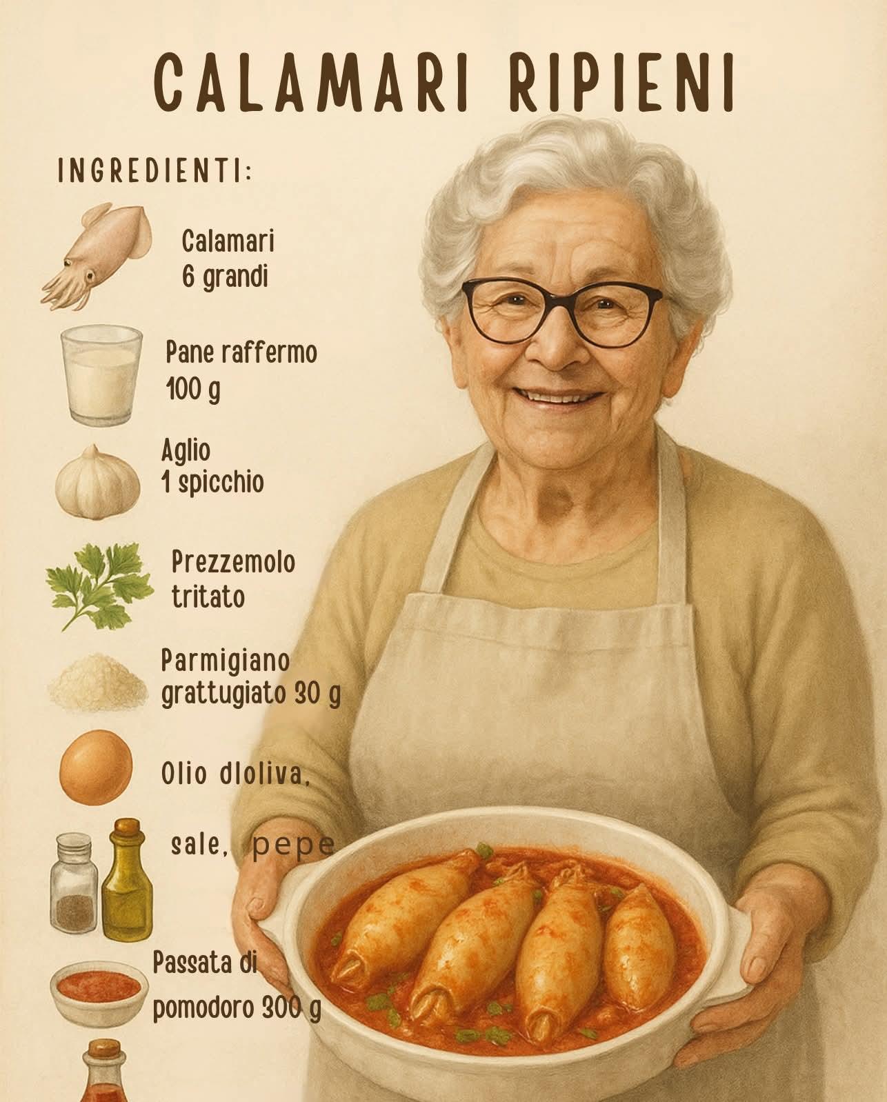 Calamari RipieniIngredienti:* Calamari 6 grandi* Pane raffermo 100 g* Latte q.b.* Aglio 1 spicchio* Prezzemolo tritato* Parmigiano grattugiato 30 g* Uovo 1* Olio d’oliva, sale, pepe* Passata di pomodoro 300 gPreparazione: Prossimo→