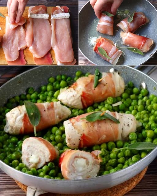 Ingredienti:600–700 g di petto di pollo a fette10 fette di speck200 g di primosale1 cipollottoolio extravergine di oliva q.b.salvia q.b.sale e pepe q.b.500 g di piselli freschi o surgelati1 bicchiere di vino biancoPreparazione: