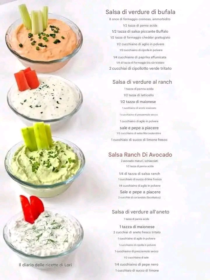 Ricette1. Salsa di verdure Buffalo225 g di formaggio cremoso ammorbidito1/2 tazza di panna da cucina o yogurt greco1/2 tazza di salsa piccante Buffalo (come la Frank’s RedHot)1/2 tazza di formaggio cheddar grattugiato1/2 cucchiaino di aglio in polvere1/2 cucchiaino di cipolla in polvere1/4 di cucchiaino di paprika affumicata1/4 di tazza di formaggio blu sbriciolato2 cucchiai di … Read more