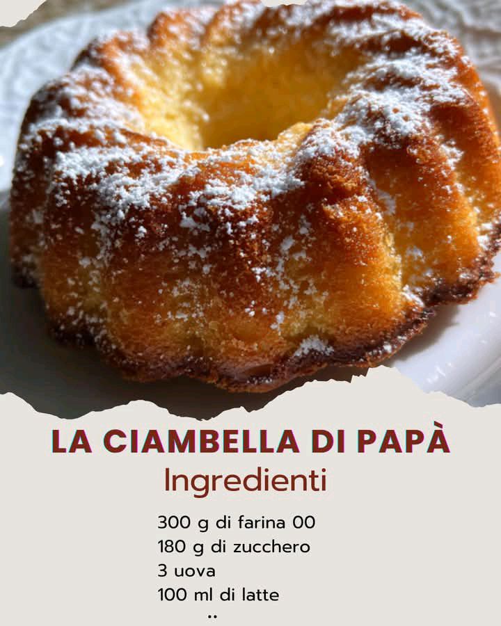 La ciambella di papà– Ricetta Tradizionale Ingredienti:300 g di farina 00180 g di zucchero3 uova100 ml di latte100 ml di olio di semi (o 80 g di burro fuso)1 bustina di lievito per dolciScorza grattugiata di 1 limone (o di un’arancia)1 bustina di vanillina (facoltativa)Zucchero a velo per decorare Procedimento: