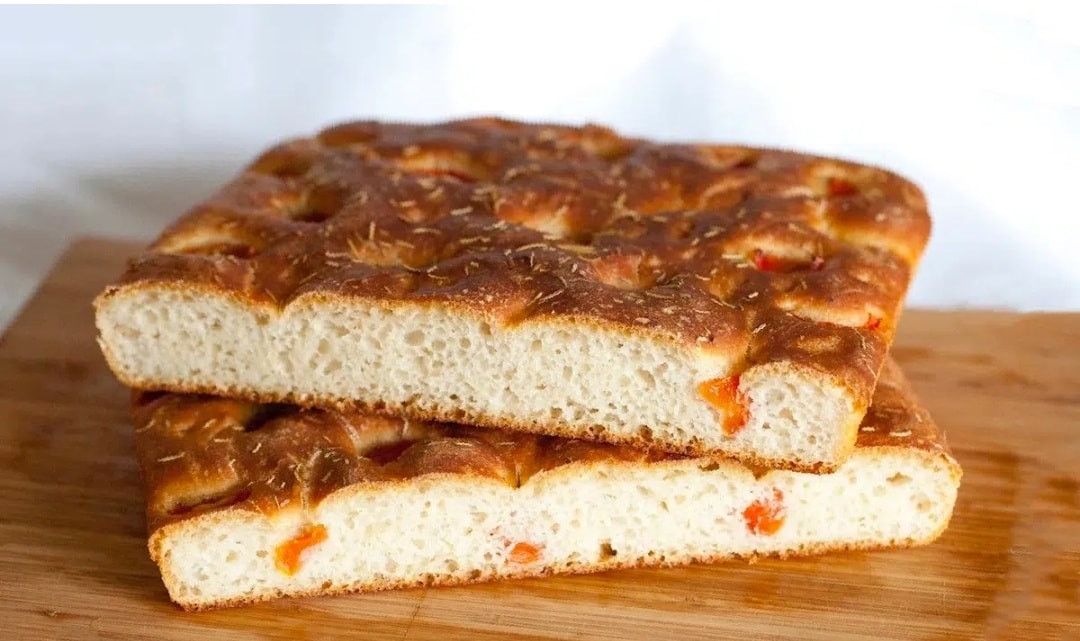 Ingredienti 150 g di lievito madre 100 g di latte 350 g di acqua 300 g di semola di grano duro 300 g di farina di grano tenero 10 pomodorini Rosmarino 1 cucchiaino di malto 1 cucchiaino di zucchero 1 cucchiaino di sale Preparazione – Focaccia al pomodoro