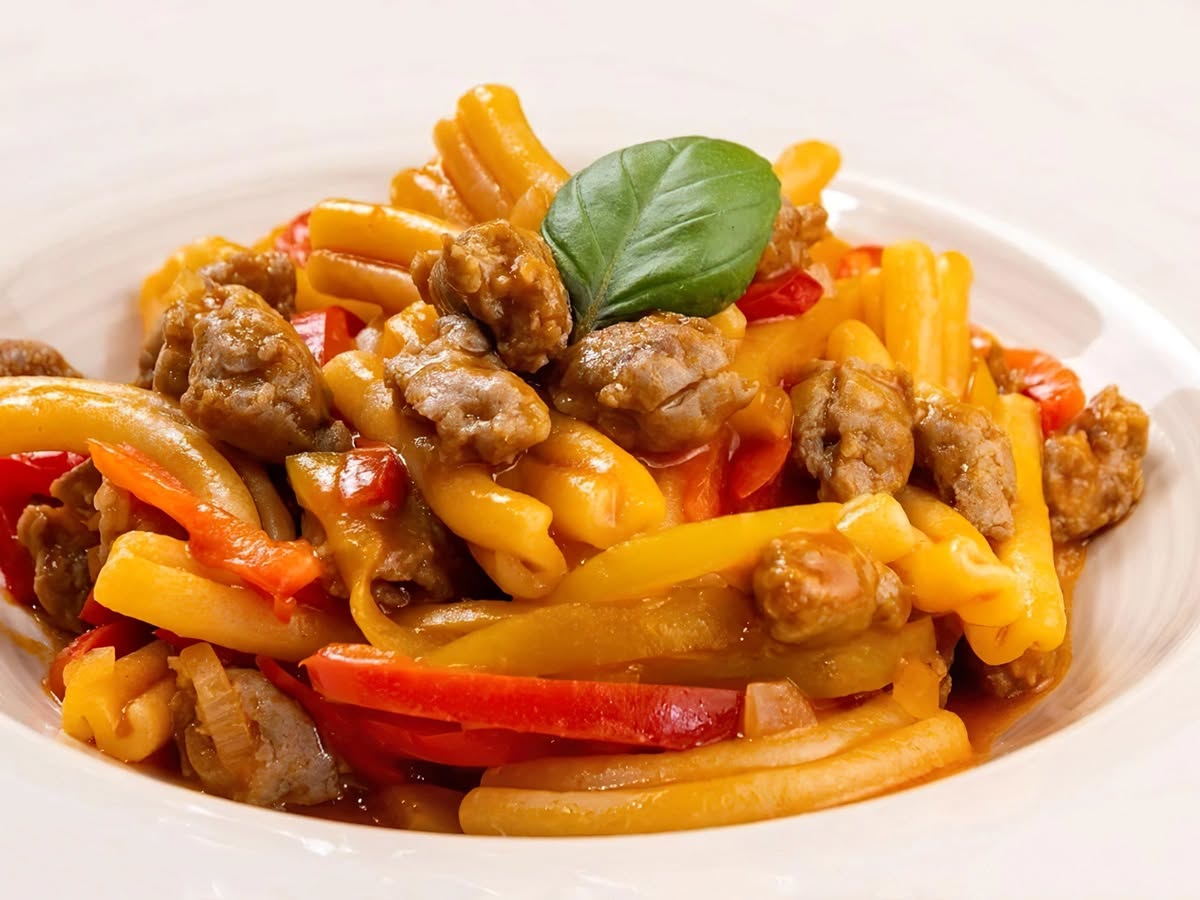 Ingredienti 320 g di pasta 300 g di salsicce 1 peperone rosso 1 peperone giallo 1 cipolla 30 ml di concentrato di pomodoro Olio d’oliva q.b. Sale Basilico Preparazione della pasta con peperoni e salsicce