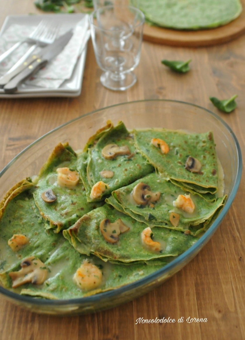 Le Crepes verdi con gamberi e funghi champignon sono un primo piatto molto particolare, raffinato e di grande effetto visivo. Perfetto se volete stupire qualcuno…magari la persona amata, oppure i vostri ospiti. Sono deliziose e con un mix di sapori che si sposano benissimo.