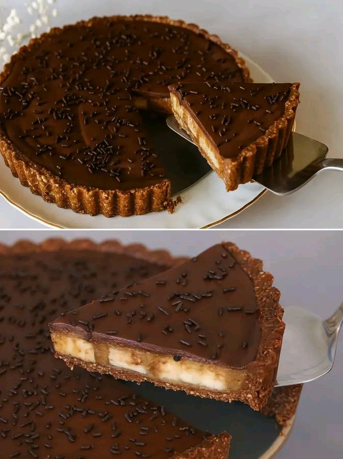 La base è realizzata con frutta secca e datteri: croccante, leggermente dolce, senza zuccheri raffinati. Il cuore è una crema vellutata di datteri e latte, arricchita da banane fresche a rondelle. E per finire, una copertura lucida al cioccolato fondente che si scioglie in bocca. Un equilibrio tra dolcezza naturale, cremosità e croccantezza, ideale per una merenda, un dopo cena o una colazione speciale.