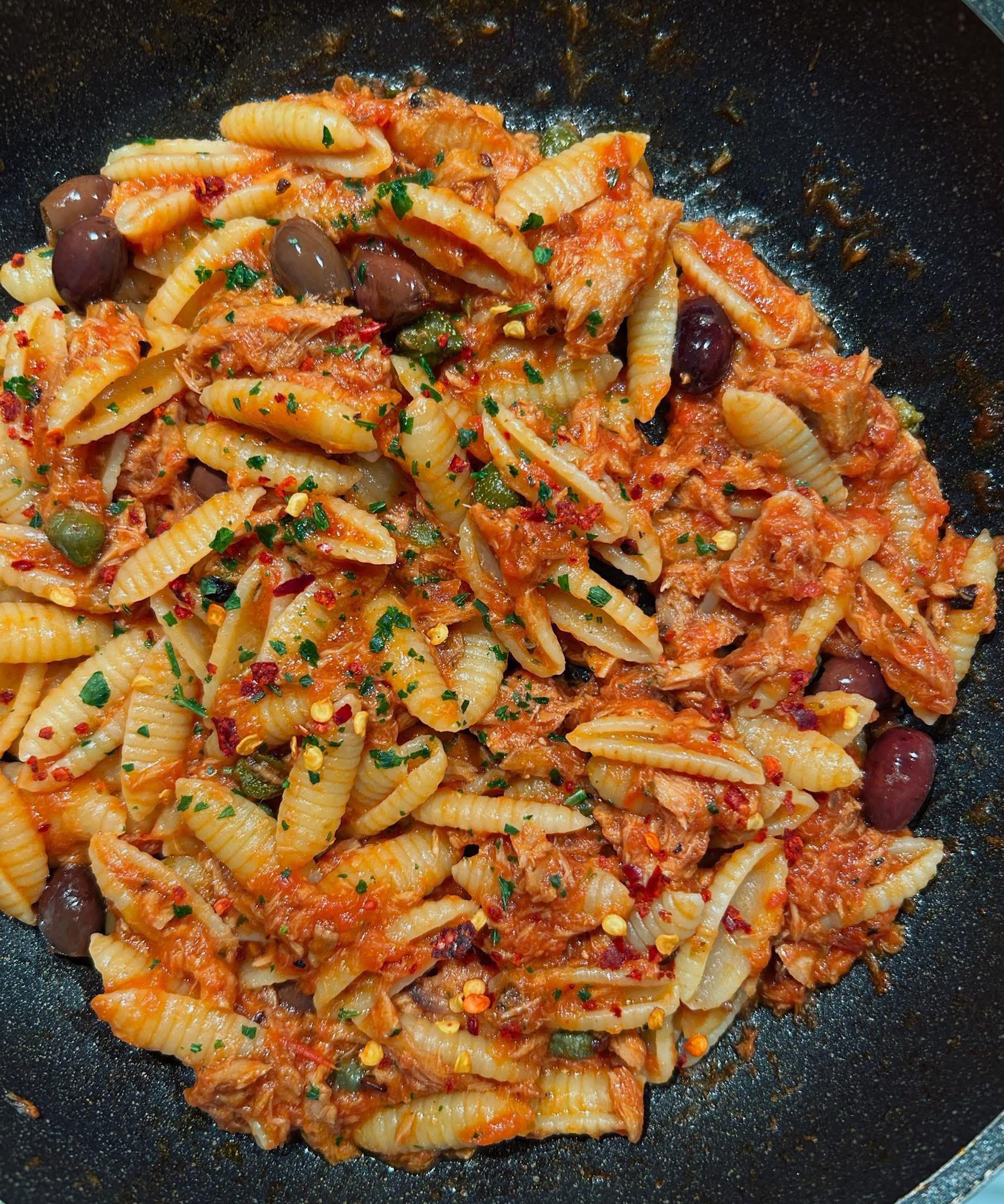 Gnocchi sardi con sugo di tonno, capperi e olive taggiasche![]()