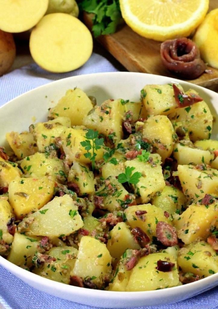 Le protagoniste sono ovviamente le patate, ma la vera magia sta tutta nel condimento: un mix profumatissimo e saporito a base di olive e capperi tritati, scorza di limone, prezzemolo fresco e una deliziosa emulsione a base di alici, olio extravergine e succo di limone.