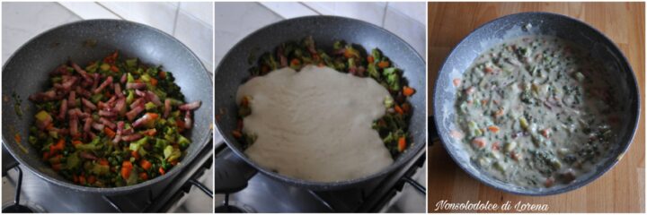 Aggiungete alle verdure la pancetta croccante e la salsa besciamella appena preparata (lasciando da parte un piccola quantità). Mescolate.