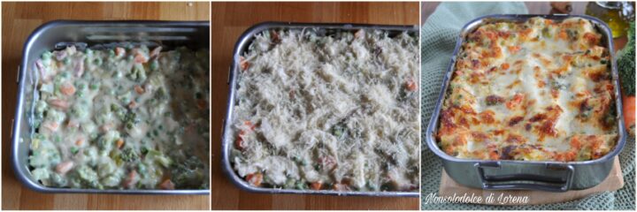 Aggiungete alle verdure la pancetta croccante e la salsa besciamella appena preparata (lasciando da parte un piccola quantità). Mescolate.