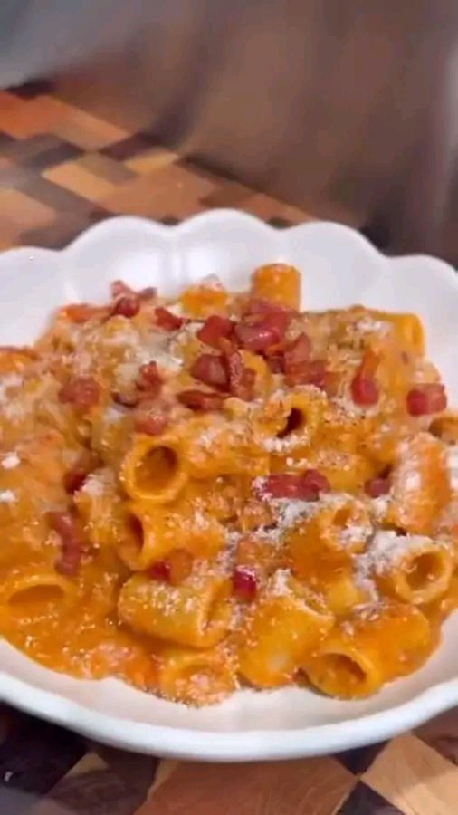 Ingredienti: . . • Mezze maniche 400 g • Pomodori pelati 600 g • Pancetta tesa 200 g • Salsiccia di maiale 200 g • Cipolle 150 g •Pecorino Romano grattugiato 40 g • Tuorli d’uovo 2 • Olio extravergine d’oliva 4 cucchiai •Sale e pepe nero q.b
