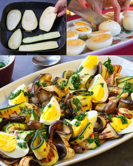 Insalata di verdure grigliate e uova sodeIngredienti:Melanzane 2Zucchine 2Peperoni 2Pomodori 4Uova 4Olio extravergine d’oliva q.b.Sale q.b.Pepe q.b.Origano q.b.