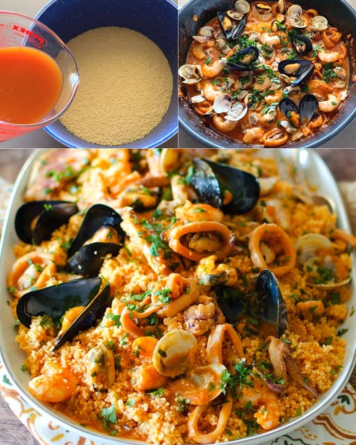 Cous cous di pesce: la ricettaIngredienti:Per il brodo di pesce:Scarti dei pesci q.b.Acqua 200 mlVino bianco 200 mlCarote 2Cipolla 1/2Sedano 1 costaPrezzemolo 1 ciuffettoConcentrato di pomodoro 50 grZafferano 1 bustinaPaprica dolce 1 cucchiainoLiquido di cozze e vongole q.b.Per il cous cous:Cous cous precotto 250 grBrodo di pesce 250 mlOlio extravergine di oliva q.b.Sale q.b.