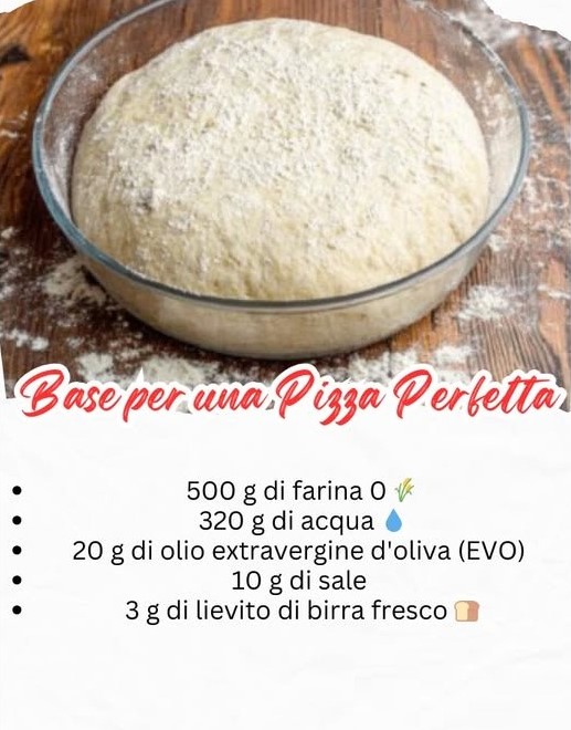 Impasto per la Pizza: La Ricetta Base per una Pizza Perfetta Tempo di preparazione: 15 minuti Tempo di lievitazione: 3 ore Tempo di cottura: 25 minuti Dosi per: 6 personeIngredienti per l’impasto 500 g di farina 0 320 g di acqua 20 g di olio extravergine d’oliva (EVO)10 g di sale3 g di lievito di birra fresco Procedimento