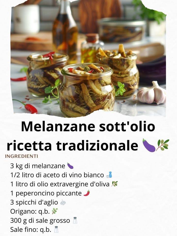 Melanzane sott’olio ricetta tradizionale Tempo di preparazione: 50 minuti Tempo di riposo: 7 giorni Porzioni: 3 barattoli da 500 g Difficoltà: FacileIngredienti:3 kg di melanzane 1/2 litro di aceto di vino bianco 1 litro di olio extravergine d’oliva 1 peperoncino piccante 3 spicchi d’aglio Origano: q.b. 300 g di sale grosso Sale fino: q.b. Procedimento: