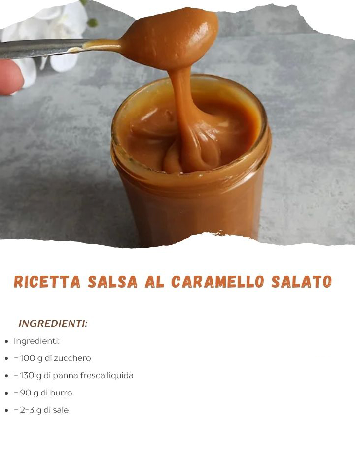 RICETTA SALSA AL CARAMELLO SALATO – salsa al caramello morbida veloce:Ingredienti:– 100 g di zucchero– 130 g di panna fresca liquida– 90 g di burro– 2-3 g di salePreparazione: