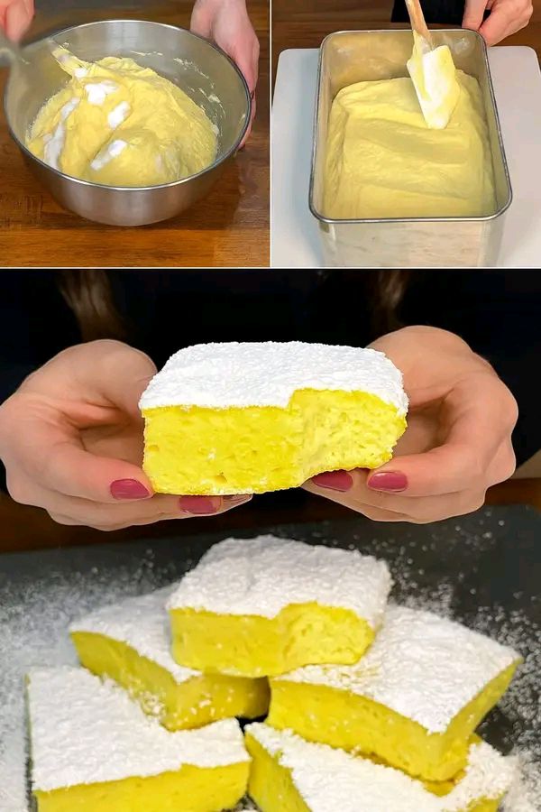 La preparo due volte a settimana: Torta NuvolaBasta unire tutto in una ciotola!Ingredienti:250 gr yogurt greco3 uova65 gr zucchero30 gr farina 0010 gr amido di mais8 gr succo di limoneBuccia di limone grattugiataZucchero a velo (per decorare)Preparazione: