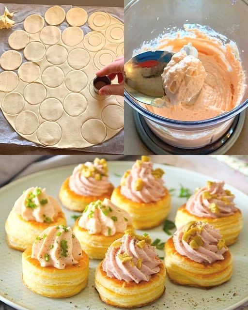 Ingredienti: PER IL VOL AU VENT: PASTA SFOGLIA ROTONDA 2 rotoli UOVO 1 PER LA MOUSSE DI SALMONE: SALMONE AFFUMICATO 100g FORMAGGIO FRESCO SPALMABILE 100g CIPOLLA PER LA MOUSSE DI MANZO: MANZO 100g FORMAGGIO FRESCO 100g OLIVE VERDI Snocciolate 6-7 PEPE MACINATO FRESCO Come fare un vol-au-vent: