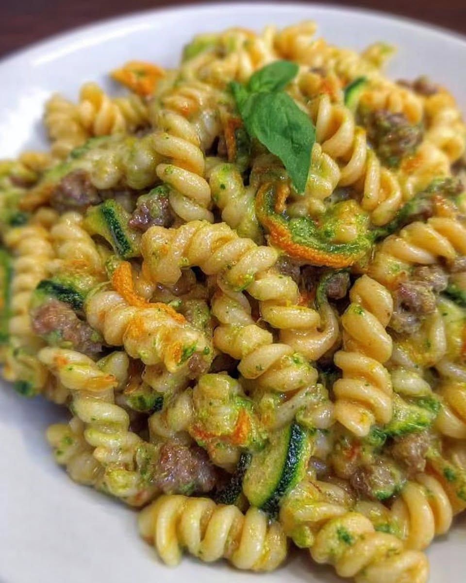 IngredientiFusilliFiori di zuccaZucchineSalsicciaCipollaOlio d’olivaVino biancoPecorinoPreparazione