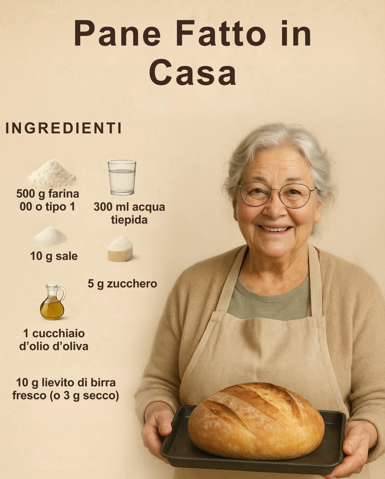 Ingredienti:* 500 g farina 00 o tipo 1* 300 ml acqua tiepida* 10 g sale* 5 g zucchero* 10 g lievito di birra fresco (o 3 g secco)* 1 cucchiaio d’olio d’olivaPreparazione: