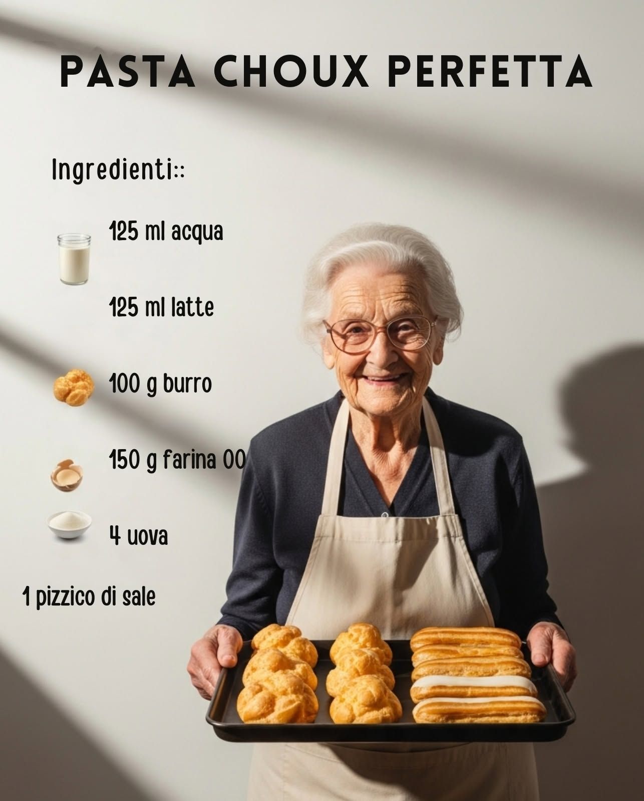 Pasta Choux Perfetta Ingredienti: * 125 ml acqua * 125 ml latte * 100 g burro * 150 g farina 00 * 4 uova * 1 pizzico di salePreparazione: Prossimo→