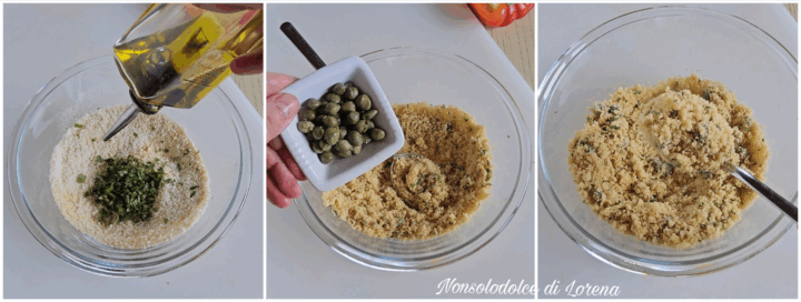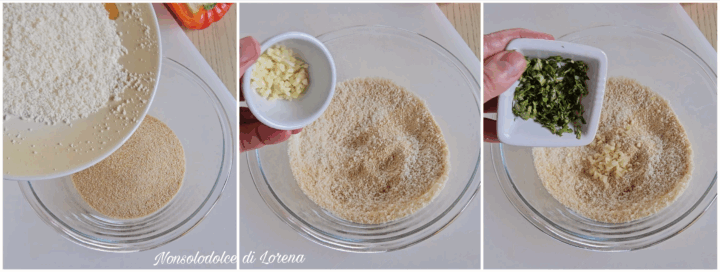 Intanto preparate la panatura: mescolate in una ciotola il pangrattato con il parmigiano grattugiato, l’aglio tritato, le erbe aromatiche tritate,