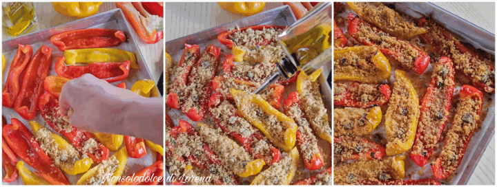 Passati circa 10 minuti togliete la teglia con i peperoni dal forno e riempiteli con la panatura.