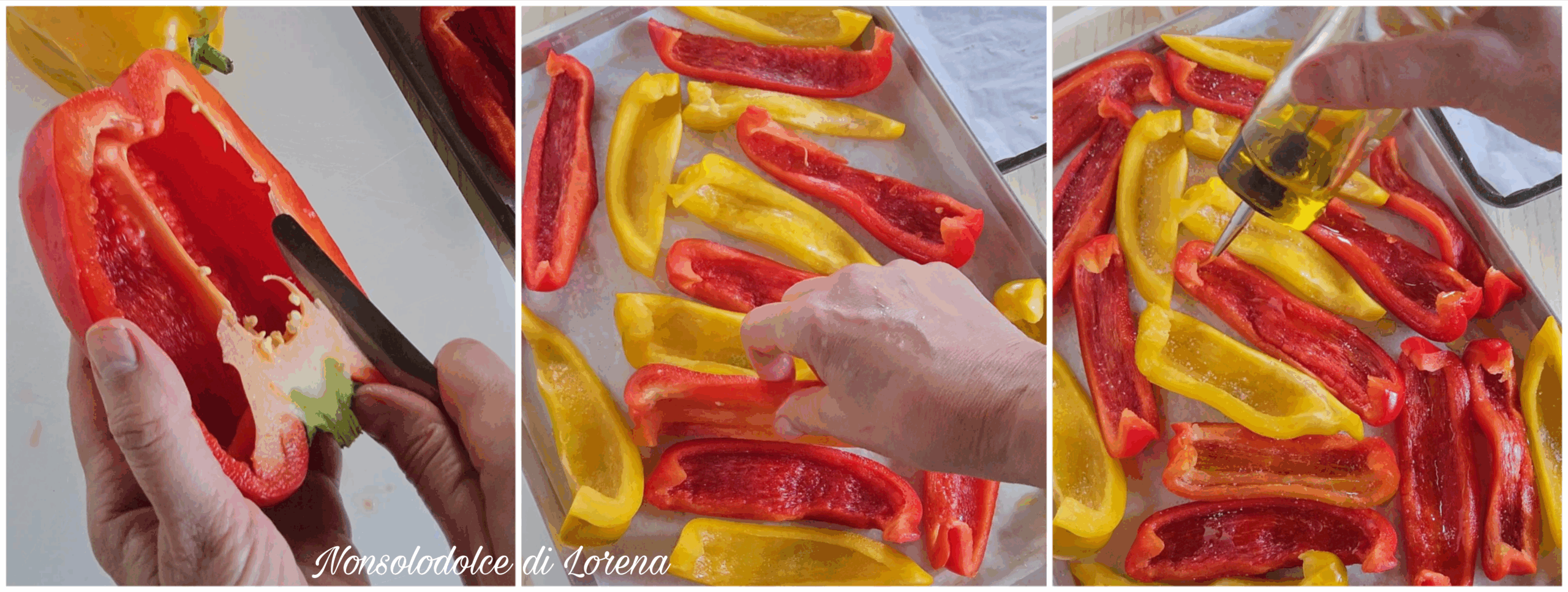 Io gli ultimi 5-10 minuti ho posizionato il forno in modalità ventilato per rendere un po’ più dorati i peperoni in superficie. Comunque vedete voi come regolarvi nel vostro forno.