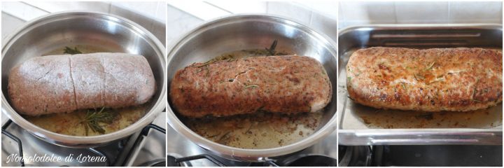 Scaldate l’olio in un tegame o meglio ancora in una teglia in acciaio, che dopo la rosolatura possa andare direttamente nel forno. Altrimenti una volta rosolata la carne la dovrete trasferire. Unite il rametto di rosmarino e il polpettone.
