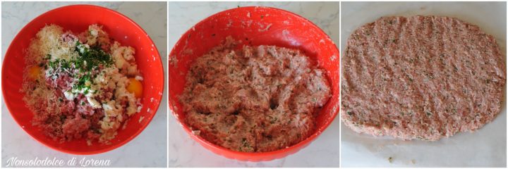 Preparate l’impasto: mettete in una terrina le carni tritate di vitello, maiale e tacchino, unite le due uova, la mollica di pane precedentemente bagnata nel latte e strizzata, il prosciutto cotto e il prezzemolo tritati, il parmigiano grattugiato, il sale e il pepe. Mescolate e amalgamate bene tutti gli ingredienti. Se l’impasto dovesse risultare troppo morbido potete aggiungere 1-2 cucchiai di pangrattato.