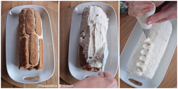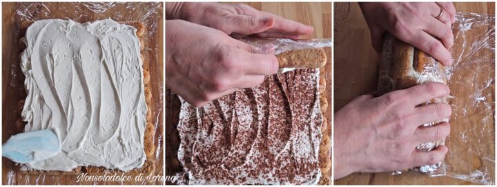 Con una buona parte della crema restante coprite il rotolo e spalmatelo con una spatola in modo da lisciarlo il meglio possibile. Io ho fatto anche qualche righetta con l’apposito attrezzino (ma questo è facoltativo ovviamente).