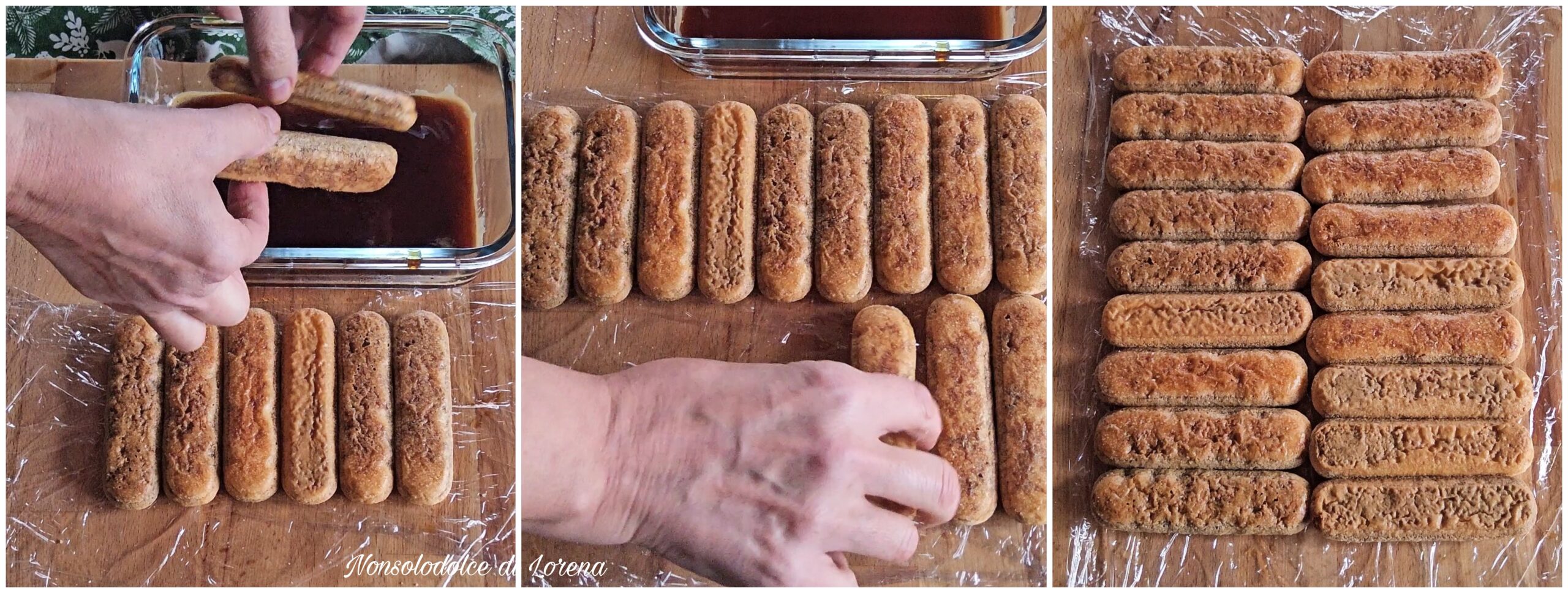 Bagnate velocemente nel caffè i savoiardi adagiandoli poi man mano sulla pellicola. Dovrete ottenere 2 file da 9 savoiardi, quindi in tutto 18.