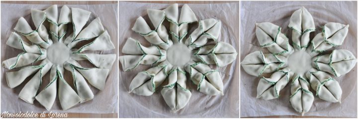 Con un coltello ben affilato dividete la sfoglia in 16 parti uguali. Per farlo con più precisione vi conviene dividerlo prima in 4 parti, poi in 8 e poi in 16.