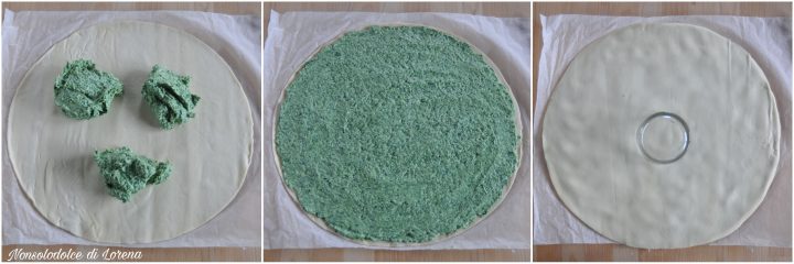 Formate la Stella di sfoglia con ricotta e spinaci: srotolate il primo rotolo di pasta sfoglia lasciandolo sulla sua carta forno. Spalmate sopra uniformemente il ripieno di ricotta e spinaci, coprite alla perfezione con il secondo rotolo di pasta sfoglia e posizionate al centro un bicchiere.