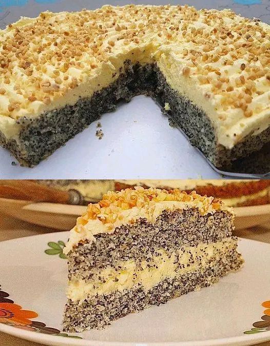 Torta senza fondo ai semi di papavero con crema paradiso e croccanti nocciole